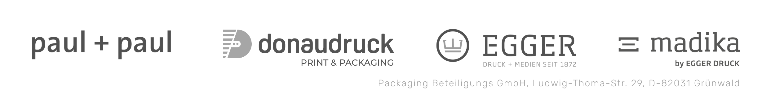 Mit unseren vier starken Marken paul + paul, Donaudruck, EGGER Druck + Medien und madika sind wir führender Anbieter für kundenspezifische Premium-Verpackungen und anspruchsvolle Point-of-Sale-Druckprodukte. Unsere rund 120 Experten entwickeln, realisieren und begleiten anspruchsvolle Verpackungsprojekte auf höchstem Qualitätsniveau in den Branchen Kosmetik, Pharma und Lifestyle.